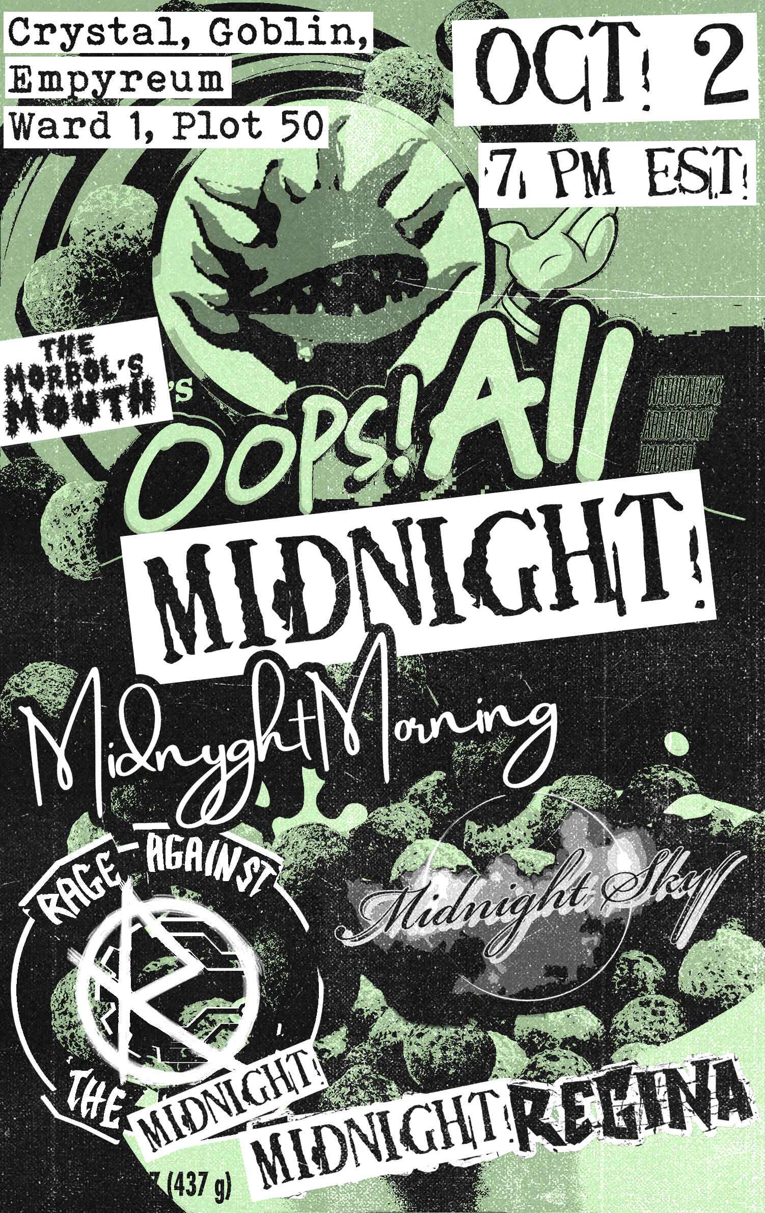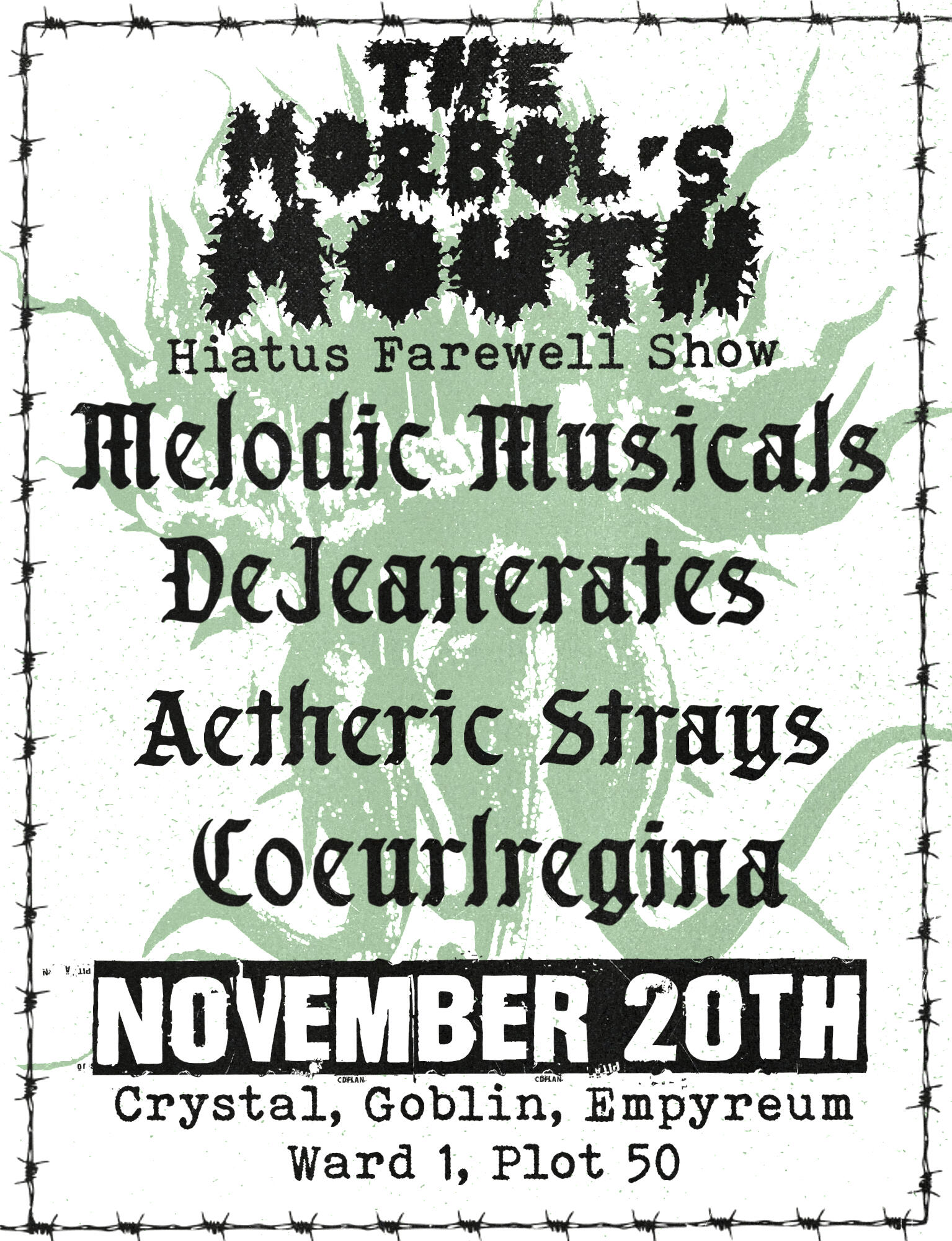 The Morbol's Mouth is an immersive rp and concert venue meant to evoke the vibe of a sketchy underground punk club while still being lore-friendly enough to fit into Eorzea. The theme is geared towards punks, metalheads, goths and other "alt" subcultures but you don't have to strictly be a part of those cultures to have fun here. We have staffed concert nights every Thursday, alternating between bard performances and DJ sets, as well as an open stage every Saturday for anyone to come and show off their skills. While we're not an erp club, we consider ourselves an 18+ community as our rp may at times deal with darker themes such as violence and crime along with many of the messier things that come with sex, drugs and rock n' roll. While these themes may get serious at times, we try to keep a relaxed atmosphere and hold inter-player consent tantamount. If all that sounds interesting to you come check us out, we look forward to seeing you!